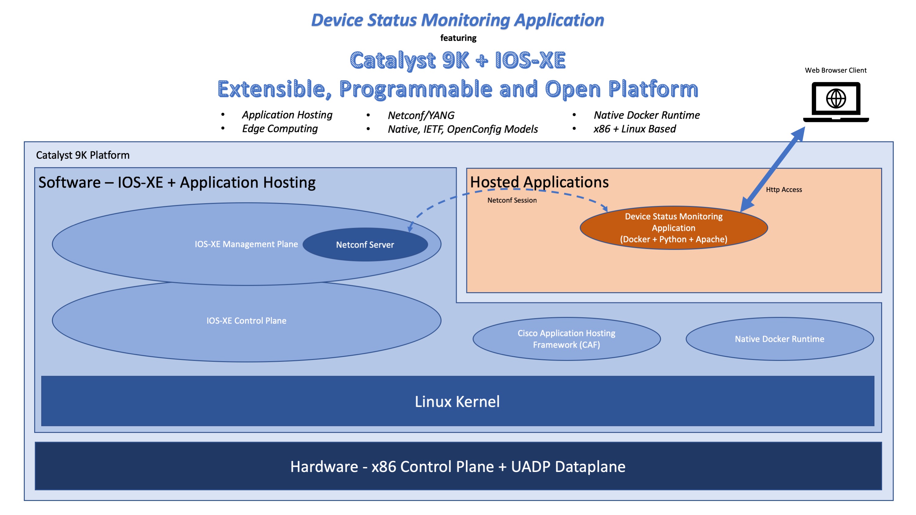 The application connects to the switch's IOS-XE management plane using a Netconf connection to collect status information, and publishes that information through a web server running in the application.