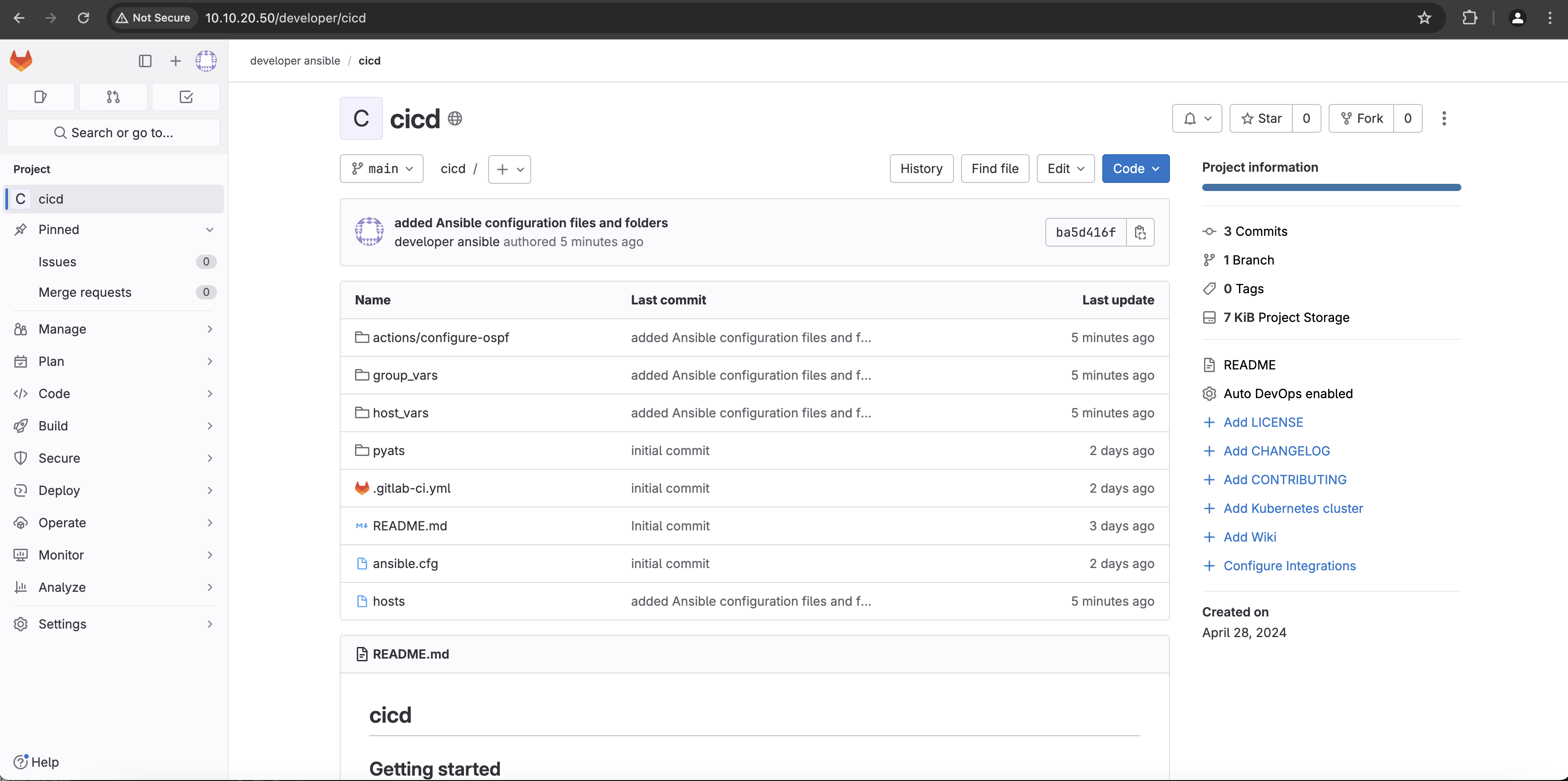 Refresh the web browser connection to http://10.10.20.50/developer/cicd and you should see the new Ansible folders and files have been successfully uploaded to GitLab.