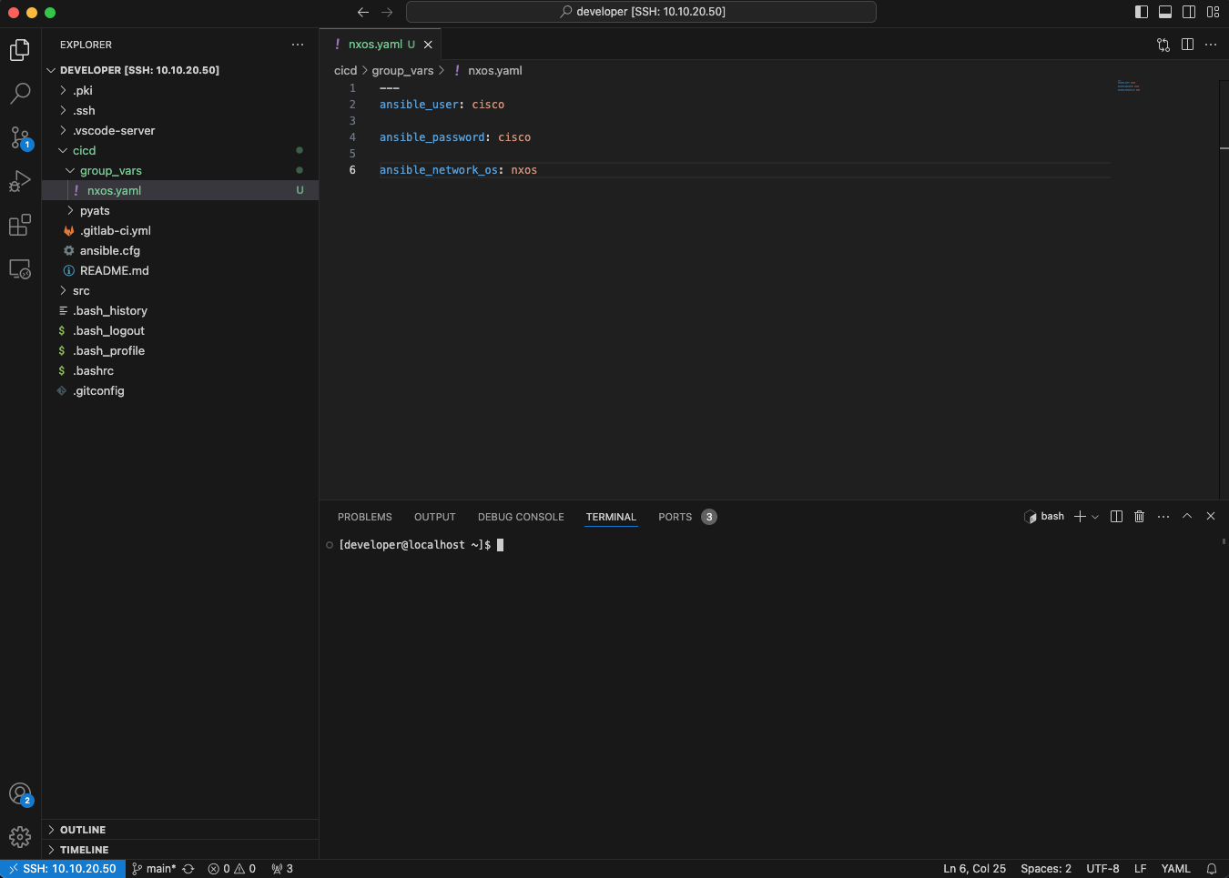 Let's start by creating a new folder called group_vars within the cicd folder. As you might know, the group_vars folder has a special meaning in Ansible. This folder contains variables, such as usernames and passwords, that apply to a group of devices. In this new group_vars folder, create a new file called nxos.yaml and populate it with the following entries. Make sure to include the three dashes, ---, at the top of the file.