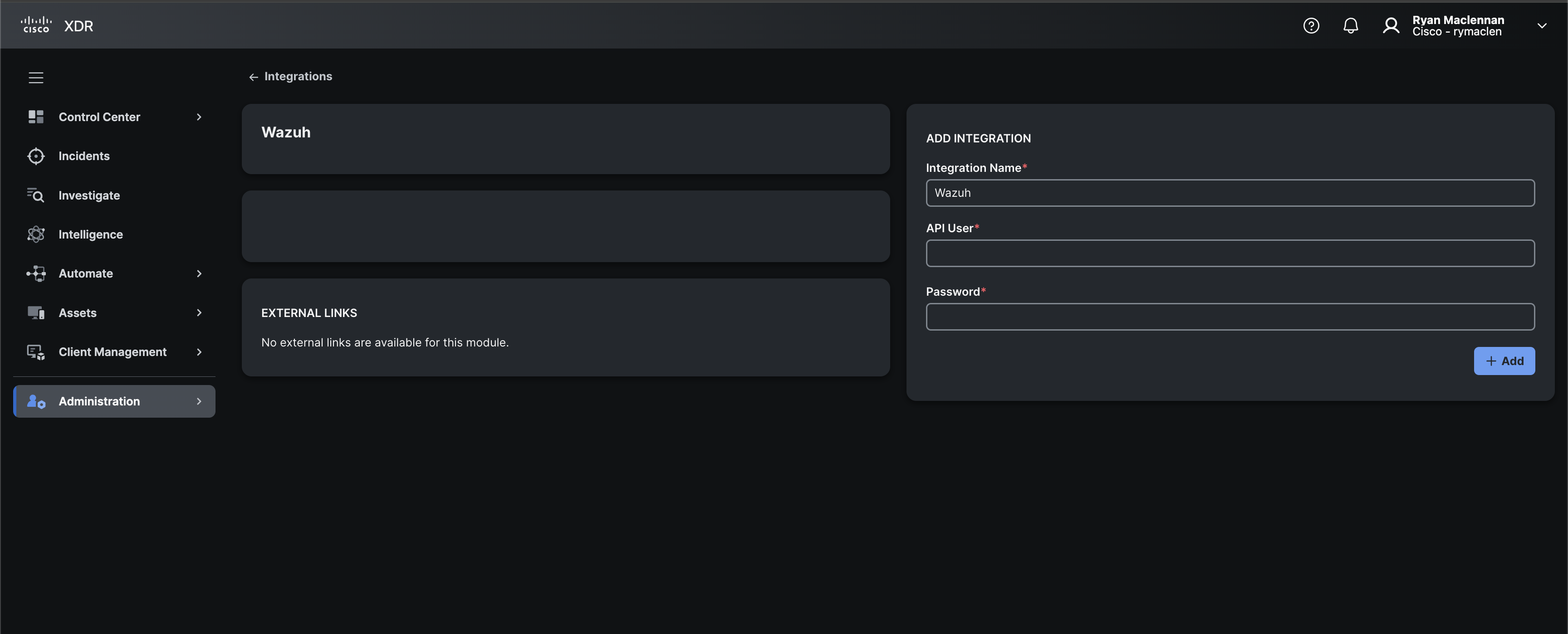 In here, add the Wazuh API user and password, then click on + Add. It should say the integration is connected after a second or two.