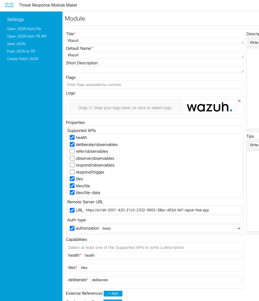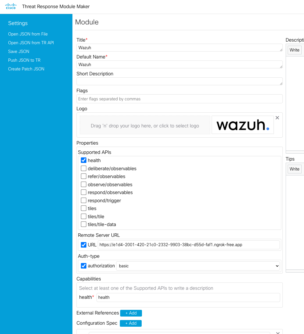 Go to the Module Maker and click on the Open JSON from File option on the top left of the page. Select the JSON file for the Wazuh module and open it.