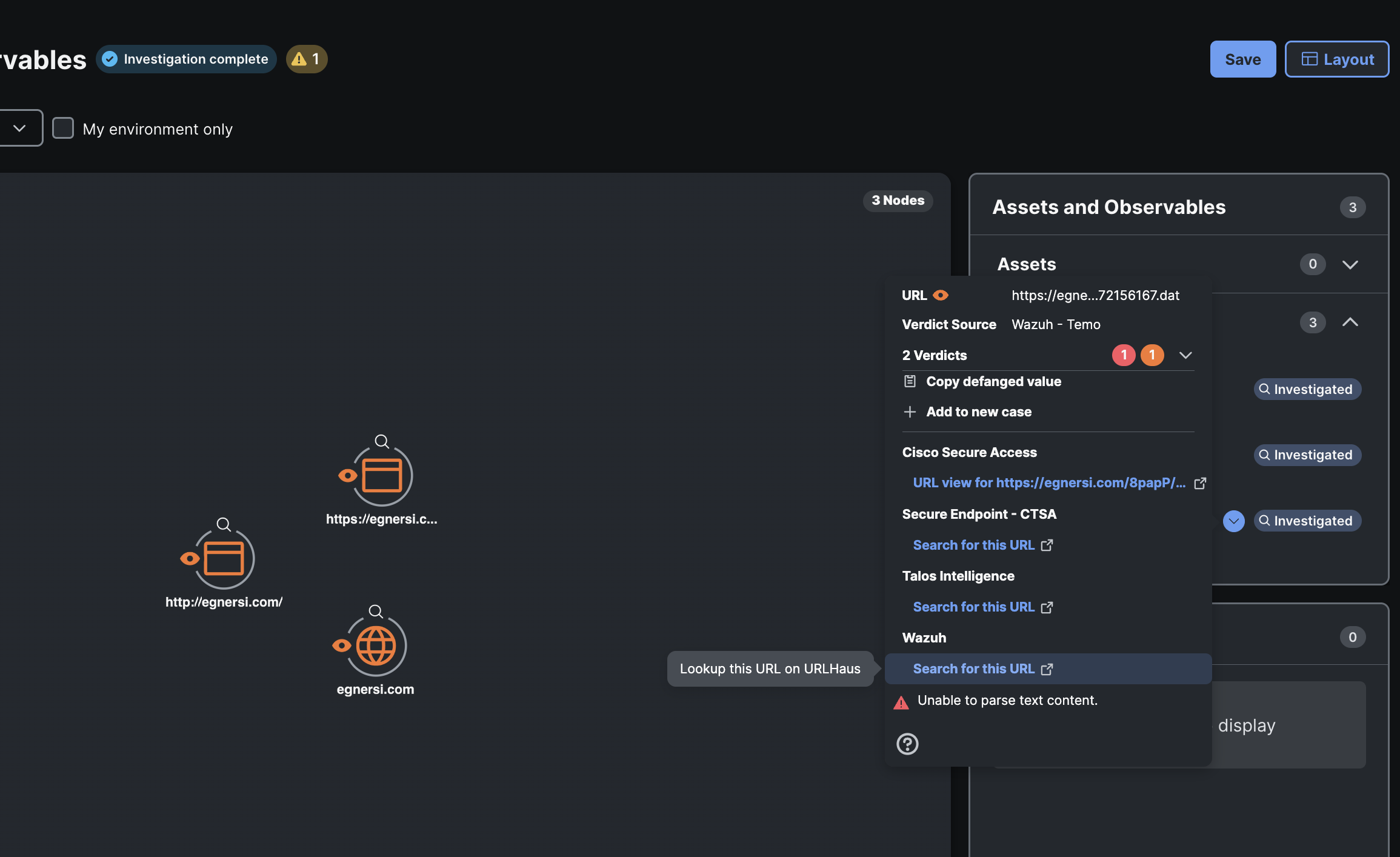 Now let’s go into the Investigation from earlier and click on the dropdown next to the URL. A new call should be made out to our relay module and then we should see a link that links out to URLHaus.