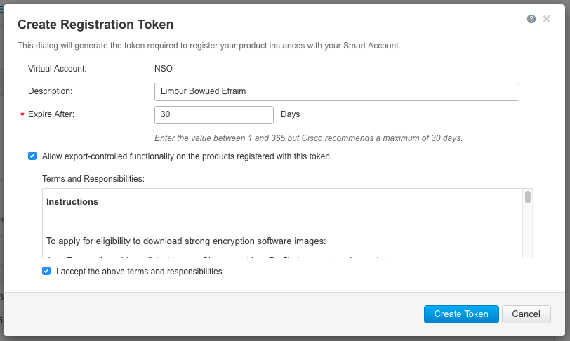 Follow the dialog to provide a description, expiration and export compliance applicability before accepting the terms and responsibilities. Click on "Create Token" to continue.
