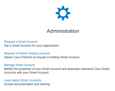 The creation of a new Smart Account is a one-time event and subsequent management of users is a capability provided through the tool. To request a Smart Account, visit Cisco Cisco Software Central and take the following steps: