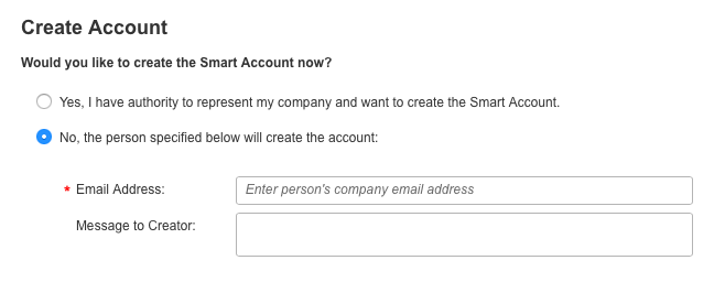 Select the type of Smart Account to create. There are two options: (a) Individual Smart Account requiring agreement to represent your company. By creating this Smart Account you agree to authorization to create and manage product and service entitlements, users and roles on behalf of your organization. (b) Create the account on behalf of someone else.