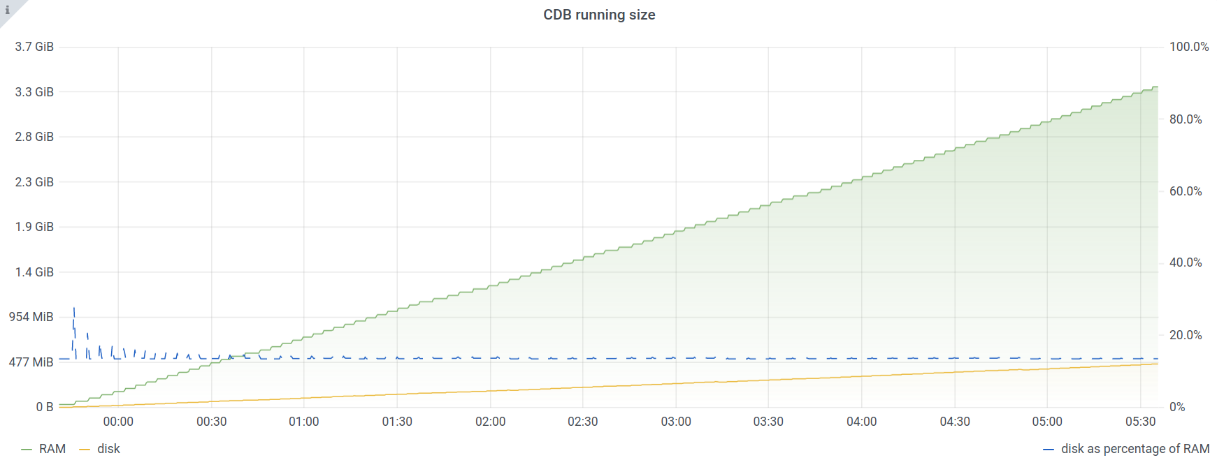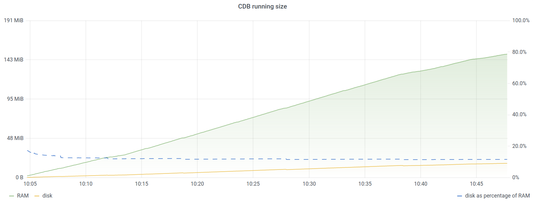 Compared to the size of CDB before we added the device, we can deduce that the device with its configuration takes up ~214 kB in RAM and 25 kB on disk. Adding 1000 such devices, we see how CDB resource consumption increases linearly with more devices. This graph shows the RAM and memory usage of the running datastore in CDB over time. We perform a sequential sync-from operation on the 1000 devices, and while it is executing, we see how resource consumption increases. At the end, resource consumption has reached about 150 MB of RAM and 25 MB of disk, equating to ~150 KiB of RAM and ~25 KiB of disk per device.