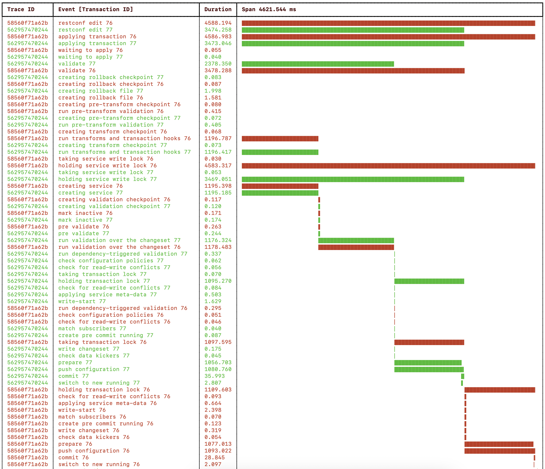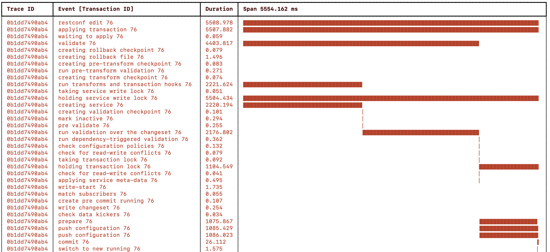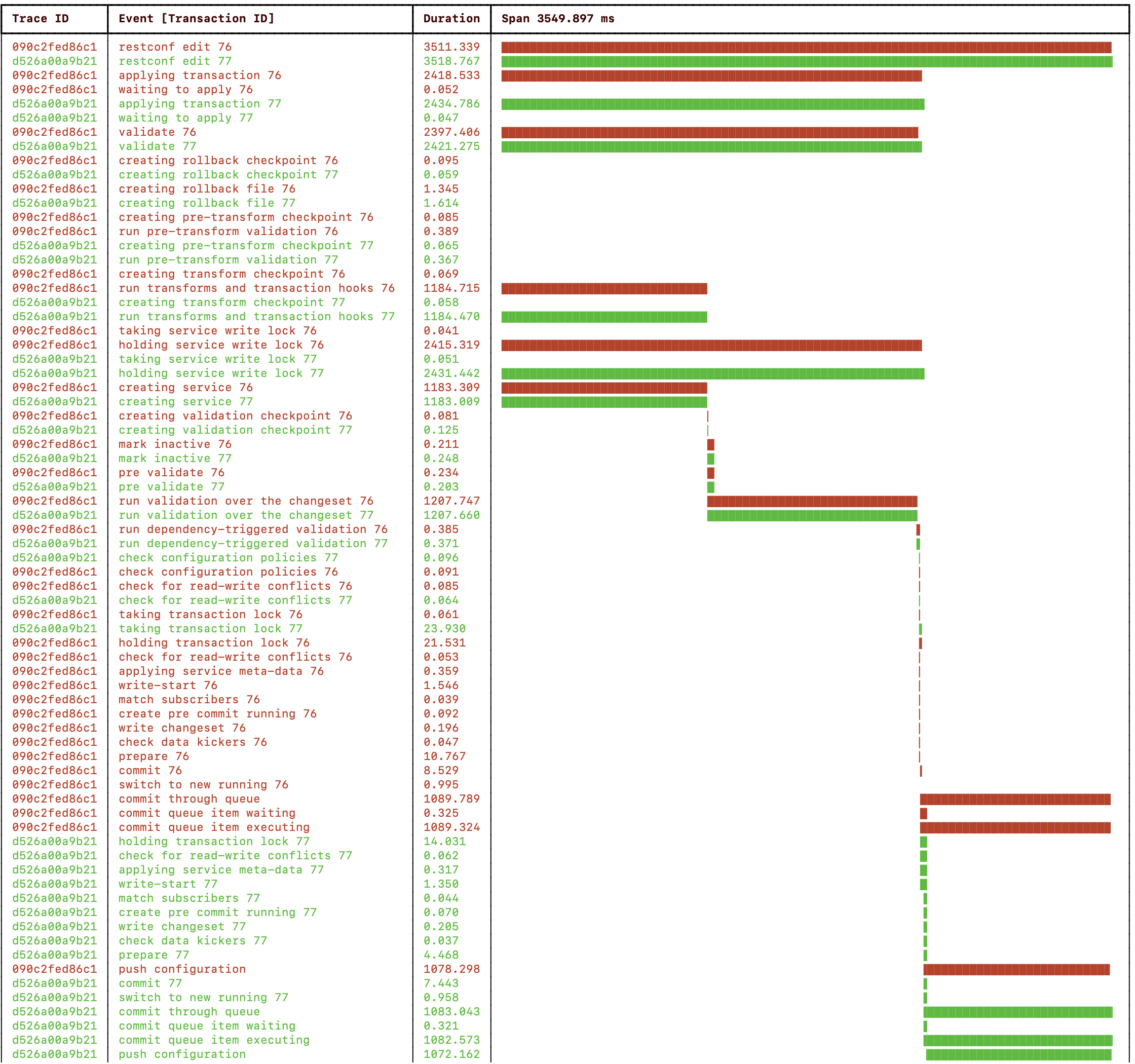 admin@ncs(config-mysvc-test)# commit | details 2022-09-16T09:17:48.977 applying transaction... entering validate phase for running usid=54 tid=225 trace-id=3a4a3b7f-a09f-4f9d-b05e-1656310ea5b6 2022-09-16T09:17:48.977 creating rollback checkpoint... ok (0.000 s) 2022-09-16T09:17:48.978 creating rollback file... ok (0.004 s) 2022-09-16T09:17:48.983 creating pre-transform checkpoint... ok (0.000 s) 2022-09-16T09:17:48.983 run pre-transform validation... ok (0.000 s) 2022-09-16T09:17:48.983 creating transform checkpoint... ok (0.000 s) 2022-09-16T09:17:48.983 run transforms and transaction hooks... 2022-09-16T09:17:48.985 taking service write lock... ok (0.000 s) 2022-09-16T09:17:48.985 holding service write lock... 2022-09-16T09:17:48.986 service /mysvc[name='test']: run service... ok (0.012 s) 2022-09-16T09:17:48.999 run transforms and transaction hooks: ok (0.016 s) 2022-09-16T09:17:48.999 creating validation checkpoint... ok (0.000 s) 2022-09-16T09:17:49.000 mark inactive... ok (0.000 s) 2022-09-16T09:17:49.001 pre validate... ok (0.000 s) 2022-09-16T09:17:49.001 run validation over the changeset... ok (0.000 s) 2022-09-16T09:17:49.002 run dependency-triggered validation... ok (0.000 s) 2022-09-16T09:17:49.003 check configuration policies... ok (0.000 s) 2022-09-16T09:17:49.003 check for read-write conflicts... ok (0.000 s) 2022-09-16T09:17:49.004 taking transaction lock... ok (0.000 s) 2022-09-16T09:17:49.004 holding transaction lock... 2022-09-16T09:17:49.004 check for read-write conflicts... ok (0.000 s) 2022-09-16T09:17:49.004 applying service meta-data... ok (0.000 s) leaving validate phase for running usid=54 tid=225 trace-id=3a4a3b7f-a09f-4f9d-b05e-1656310ea5b6 (0.028 s) entering write-start phase for running usid=54 tid=225 trace-id=3a4a3b7f-a09f-4f9d-b05e-1656310ea5b6 2022-09-16T09:17:49.005 cdb: write-start 2022-09-16T09:17:49.006 ncs-internal-service-mux: write-start 2022-09-16T09:17:49.006 ncs-internal-device-mgr: write-start 2022-09-16T09:17:49.007 cdb: match subscribers... ok (0.000 s) 2022-09-16T09:17:49.007 cdb: create pre commit running... ok (0.000 s) 2022-09-16T09:17:49.007 cdb: write changeset... ok (0.000 s) 2022-09-16T09:17:49.008 check data kickers... ok (0.000 s) leaving write-start phase for running usid=54 tid=225 trace-id=3a4a3b7f-a09f-4f9d-b05e-1656310ea5b6 (0.003 s) entering prepare phase for running usid=54 tid=225 trace-id=3a4a3b7f-a09f-4f9d-b05e-1656310ea5b6 2022-09-16T09:17:49.009 cdb: prepare 2022-09-16T09:17:49.009 ncs-internal-device-mgr: prepare 2022-09-16T09:17:49.022 device ex1: push configuration... leaving prepare phase for running usid=54 tid=225 trace-id=3a4a3b7f-a09f-4f9d-b05e-1656310ea5b6 (0.121 s) entering commit phase for running usid=54 tid=225 trace-id=3a4a3b7f-a09f-4f9d-b05e-1656310ea5b6 2022-09-16T09:17:49.130 cdb: commit 2022-09-16T09:17:49.130 cdb: switch to new running... ok (0.000 s) 2022-09-16T09:17:49.132 ncs-internal-device-mgr: commit 2022-09-16T09:17:49.149 device ex1: push configuration: ok (0.126 s) 2022-09-16T09:17:49.151 holding service write lock: ok (0.166 s) 2022-09-16T09:17:49.151 holding transaction lock: ok (0.147 s) leaving commit phase for running usid=54 tid=225 trace-id=3a4a3b7f-a09f-4f9d-b05e-1656310ea5b6 (0.021 s) 2022-09-16T09:17:49.151 applying transaction: ok (0.174 s) Commit complete. admin@ncs(config-mysvc-test)#