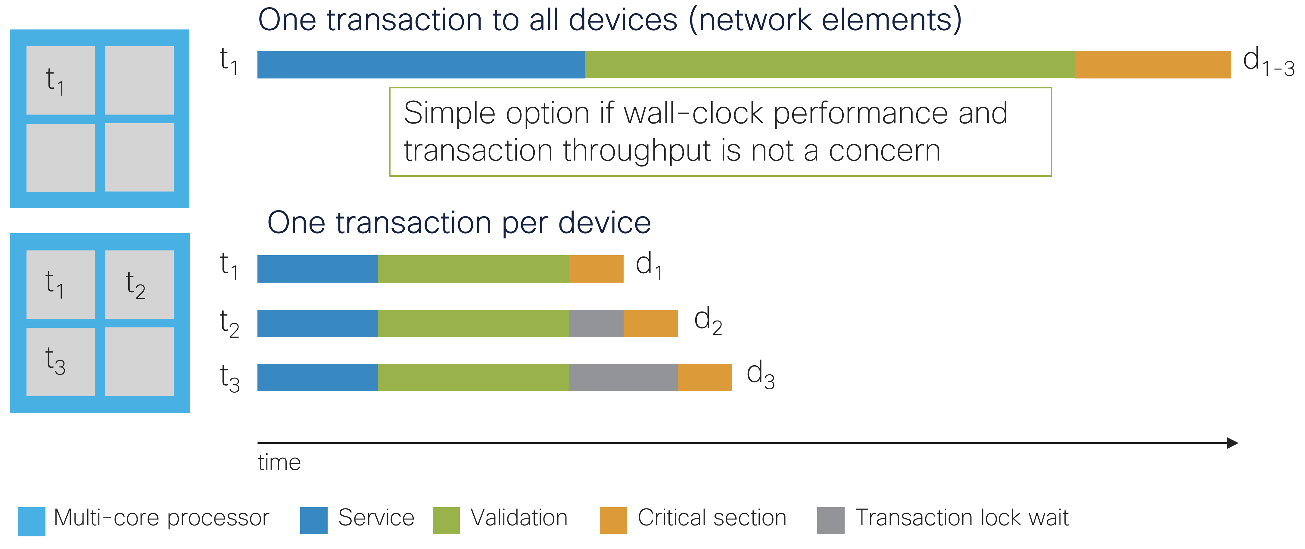 All changes in NSO happen inside a transaction. Network devices participate in the transaction, which gives you the all-or-nothing behavior, to ensure correctness and consistency across the network. But network communication is not instantaneous and a transaction in NSO holds a lock while waiting for devices to process the change. This way, changes to network devices are serialized, even when there are multiple simultaneous transactions. However, a lock blocks other transactions from proceeding, ultimately limiting the overall NSO transaction rate.