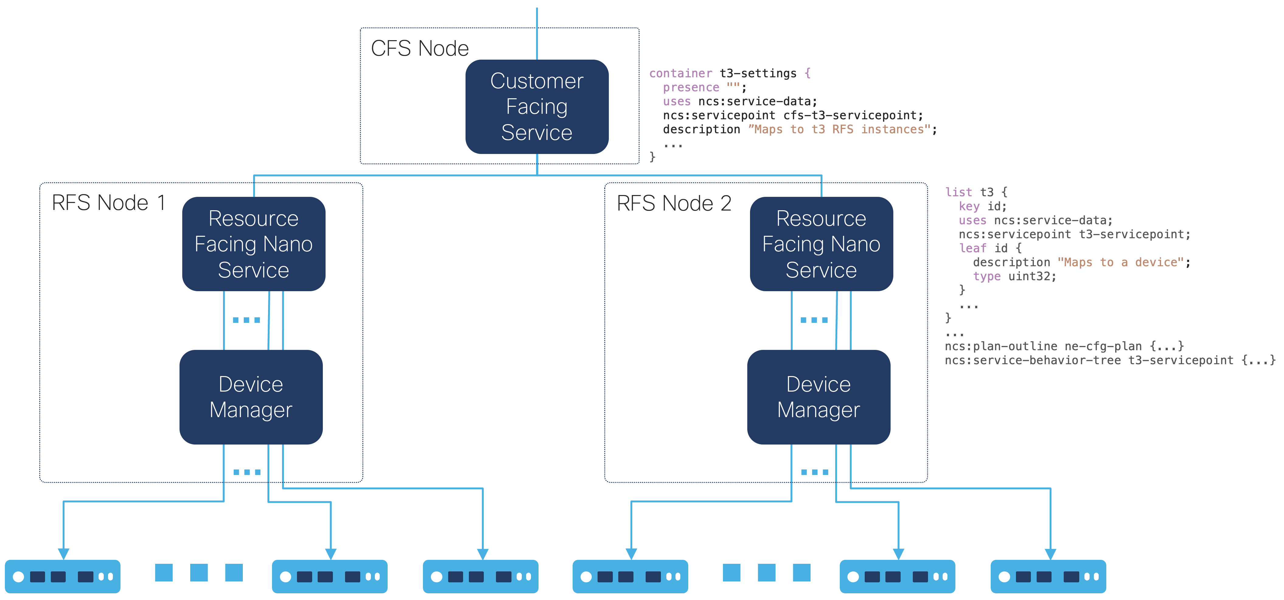 Stacked services allow the composition of many smaller services into a larger service. A common best-practice design pattern is to have one Resource Facing Service (RFS) instance map to one device or network element.