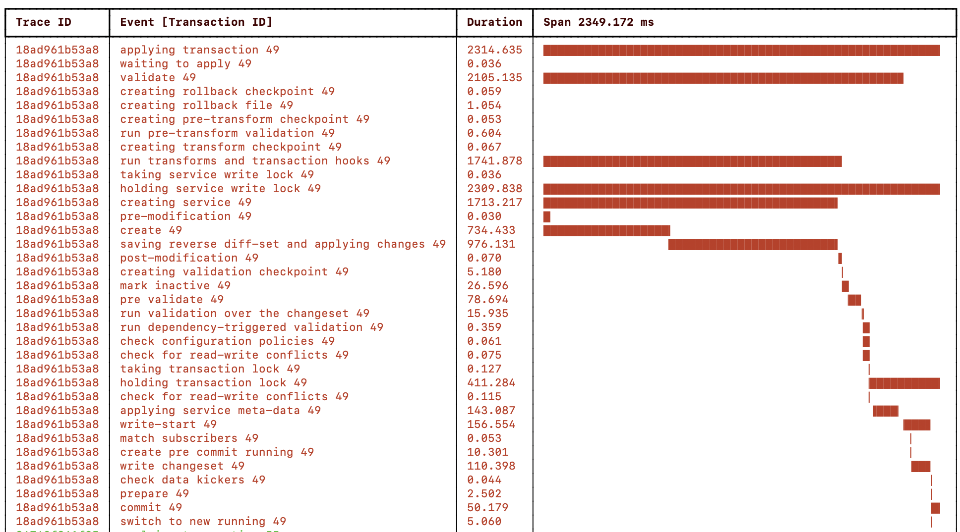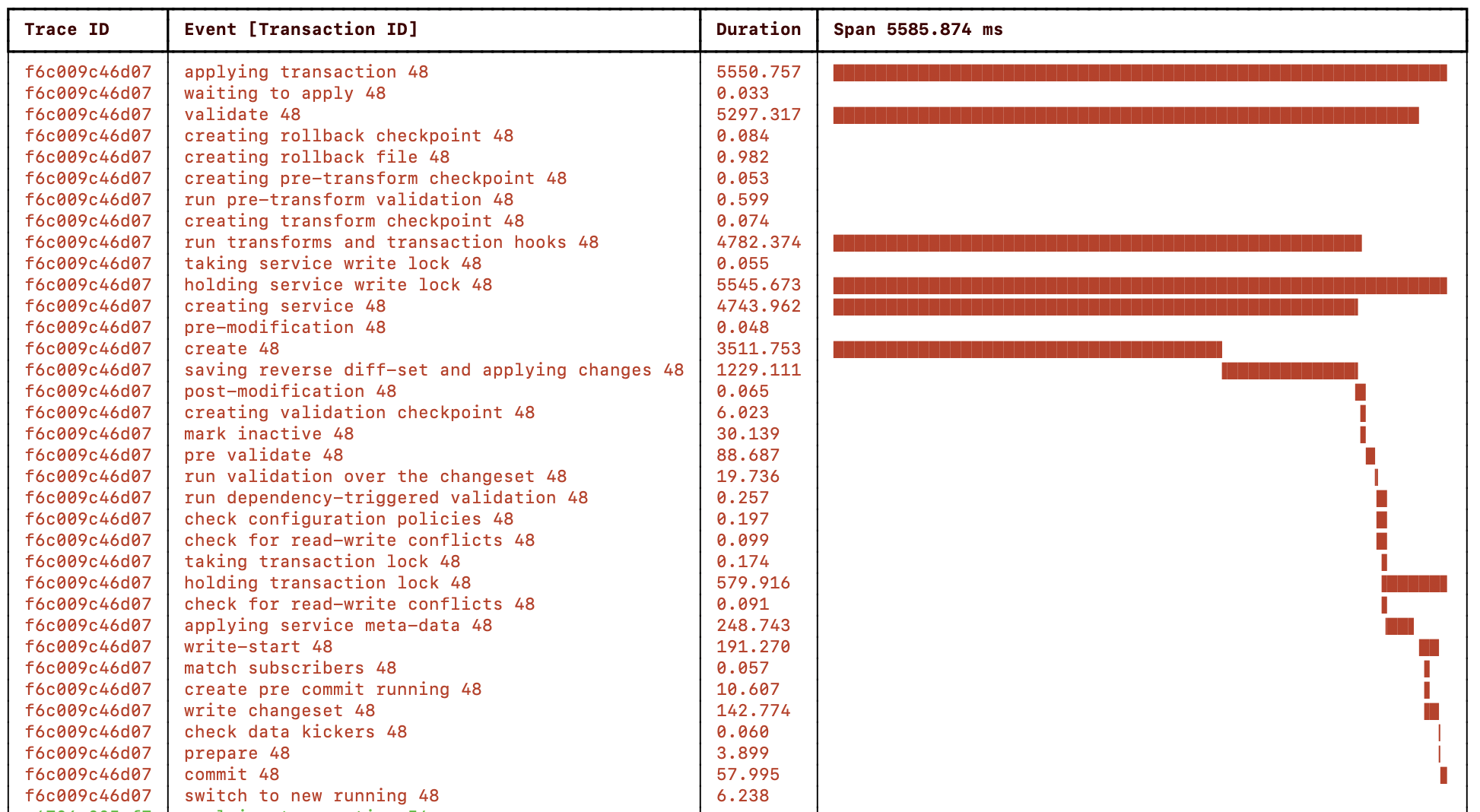 Analyzing the service in isolation can yield useful insight. But it may also lead you in the wrong direction, because some issues only manifest under load and the data from a live system can surprise you. That is why NSO supports different ways of exposing tracing information, including operational data and notification events. Remember to always verify that your observations and assumptions hold for a live, production system, too.