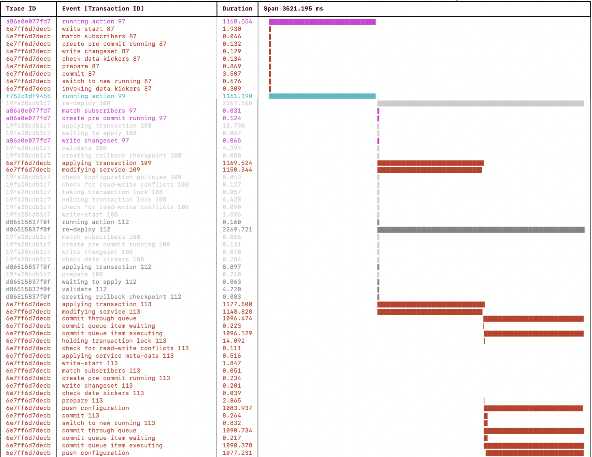 The total RESTCONF edit took ~5 seconds, and the service mapping (“creating service” event) and validation (“run validation ...” event) were done sequentially for the service instances and took 2 seconds each. The configuration push to the devices was done concurrently in 1 second.
