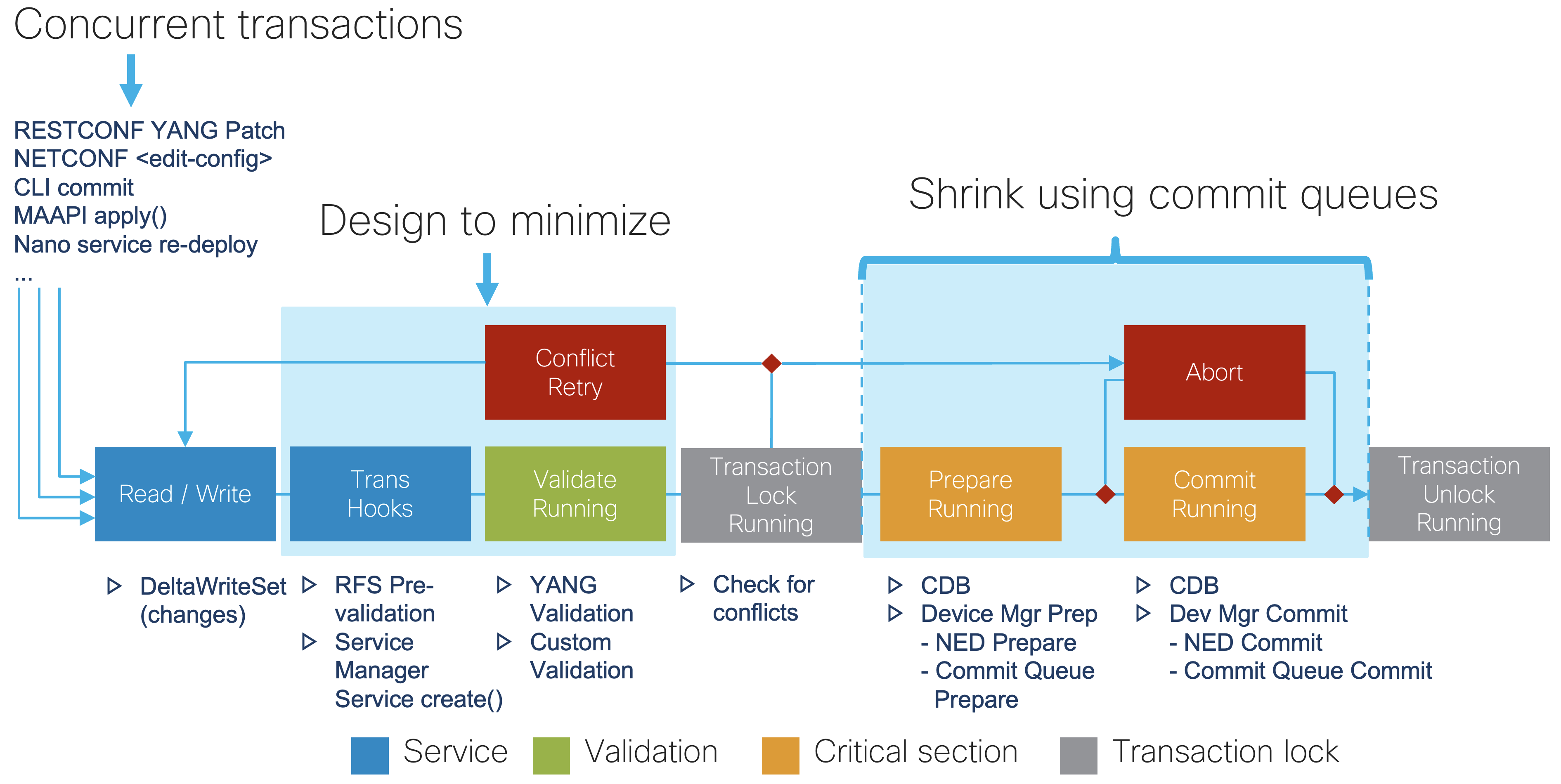 Run multiple transactions concurrently. For example, multiple concurrent RESTCONF or NETCONF edits, CLI commits, MAAPI