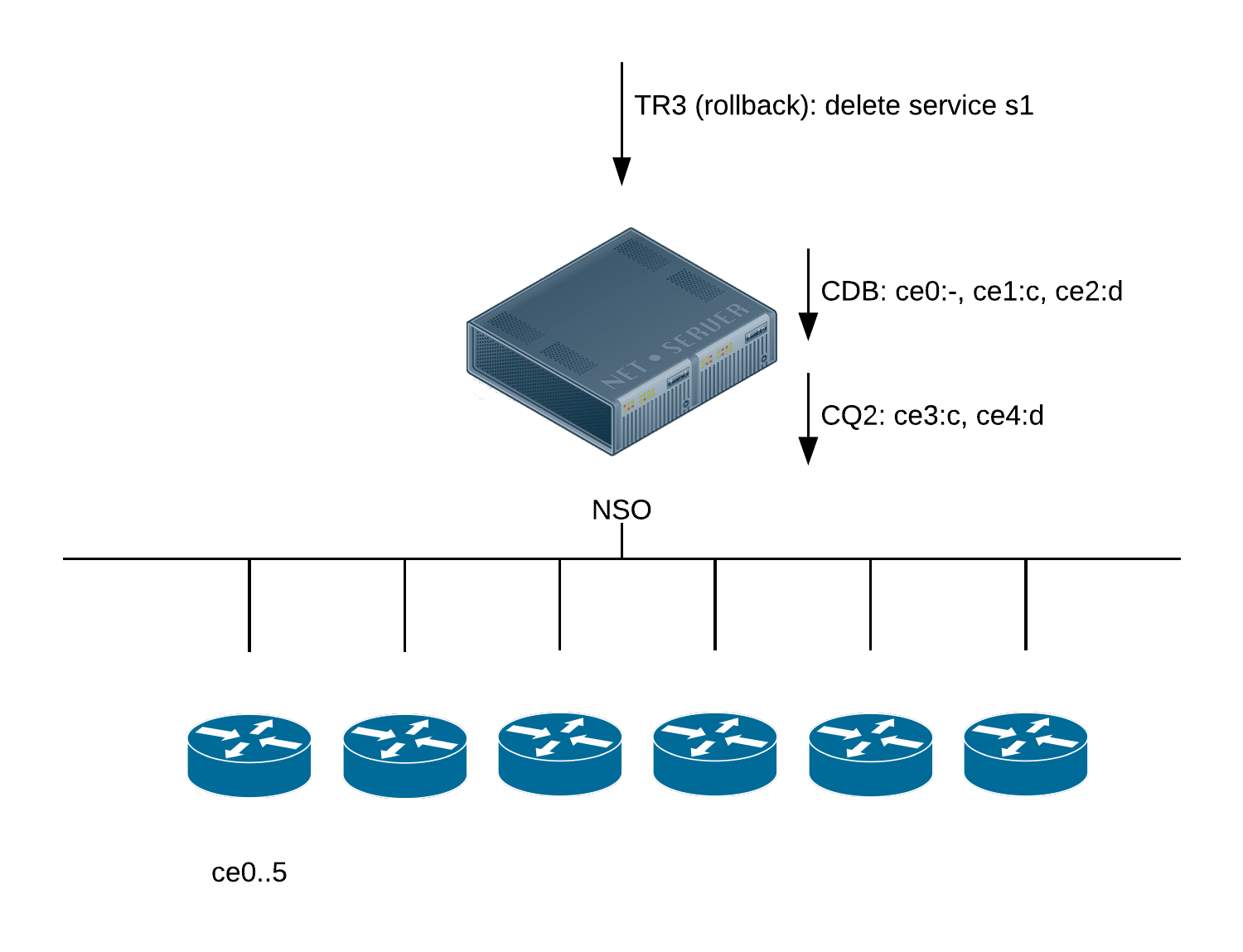 NSO orchestrates an atomic transaction that has the very desirable characteristic of either the transaction as a whole ends up on all participating devices and in the NSO primary copy, or alternatively the whole transaction is aborted and all changes are automatically rolled-back.