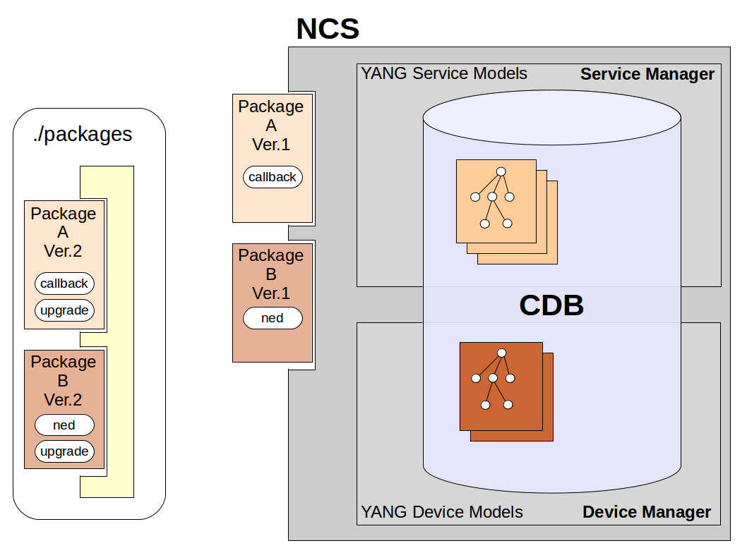 this sub-module defines the management of packages that are run by NSO. A package contains custom code, models, documentation for any function added to the NSO platform. It can for example be a service application, or a southbound integration to a device.