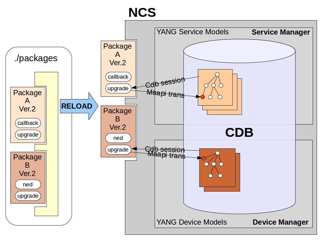 Figure 24, “NSO CDB Architecture Scenario” illustrates the architecture when CDB is used. The Application components read configuration data and subscribe to changes to the database using a simple RPC-based API. The API is part of the Java library and is fully documented in the Javadoc for CDB.