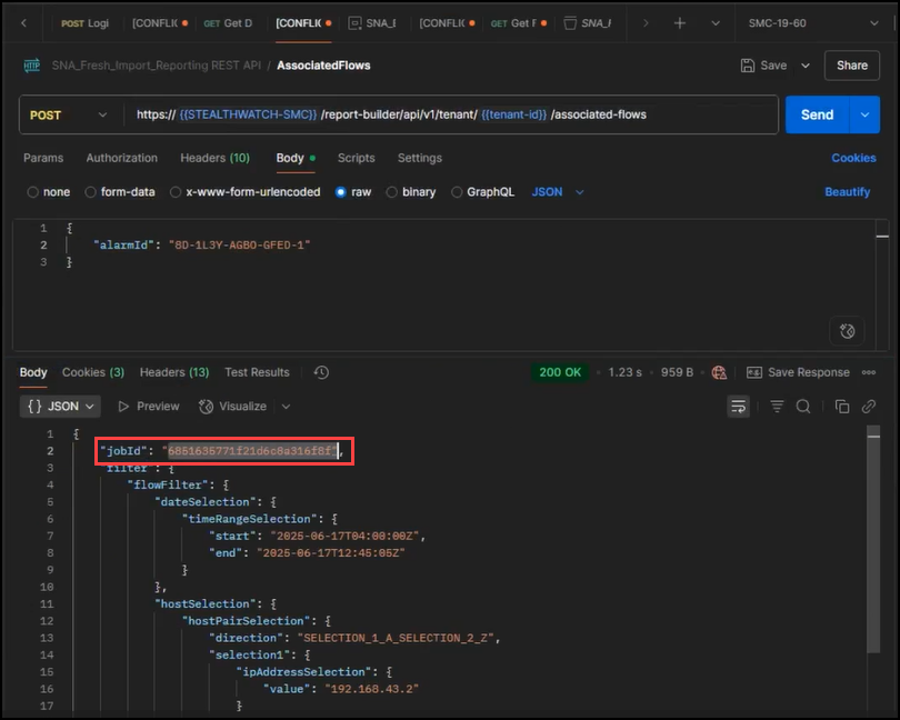Use the Alarm_ID value you have collected previously and issue a POST request to the new Associated Flows API endpoint.