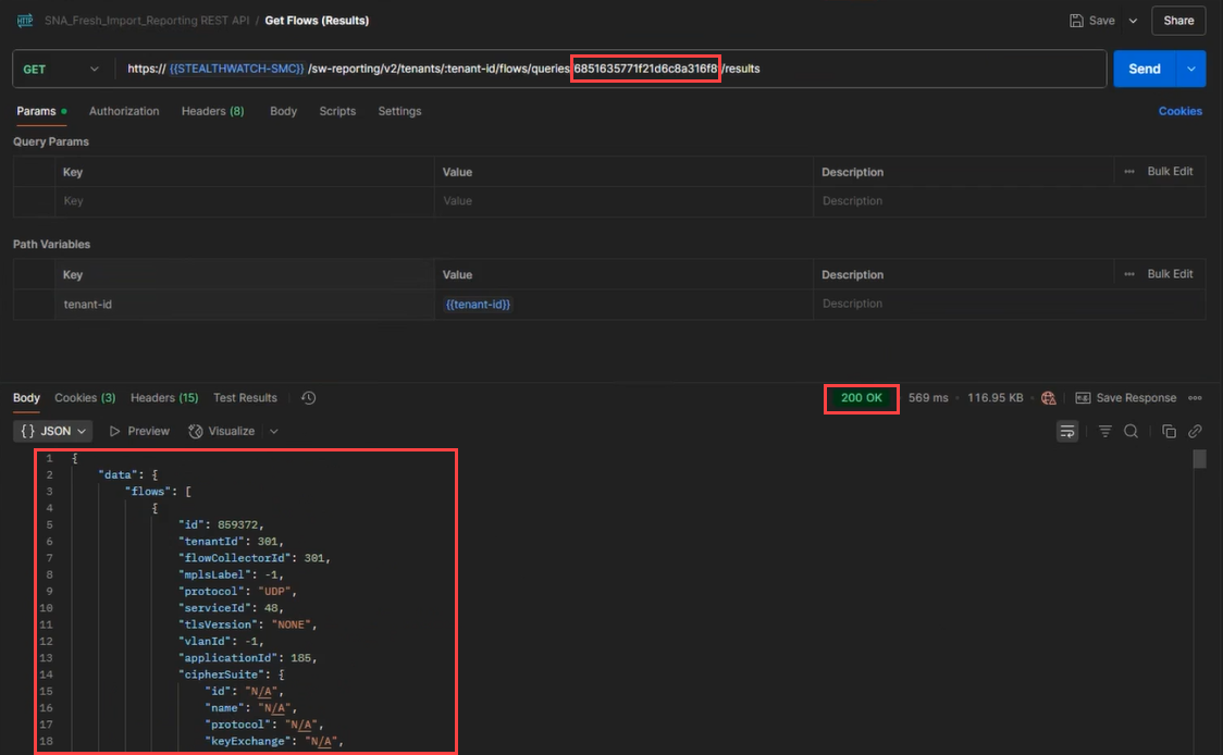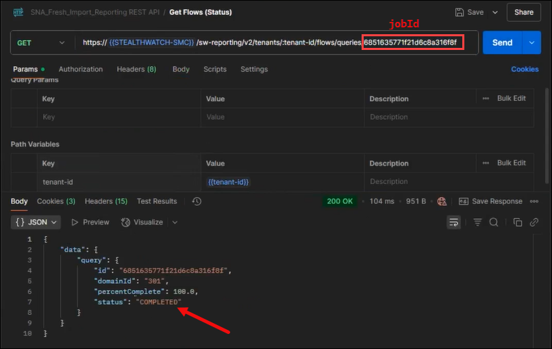 Using the flow search jobId you received previously, query the /sw-reporting/v2/tenants/<tenant-id>/flows/queries/<job_id> endpoint to return the status of the flow search.