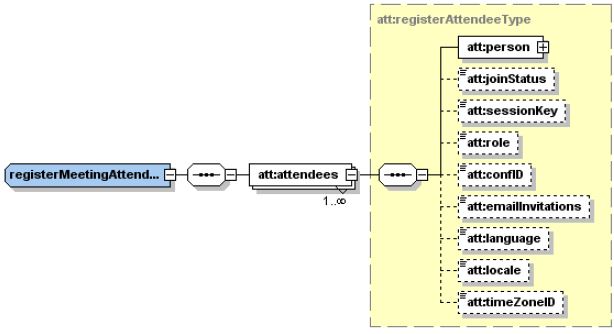 The following schema diagram shows the structure of the elements in theregisterMeetingAttendee request message.