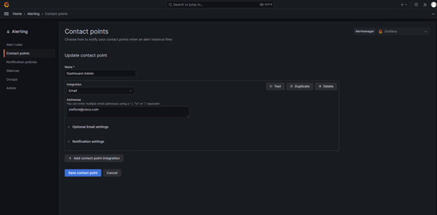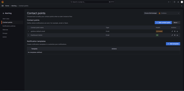 Under Alerting, select Contact points and then on the ‘pencil’ icon to the right of Dashboard Admin