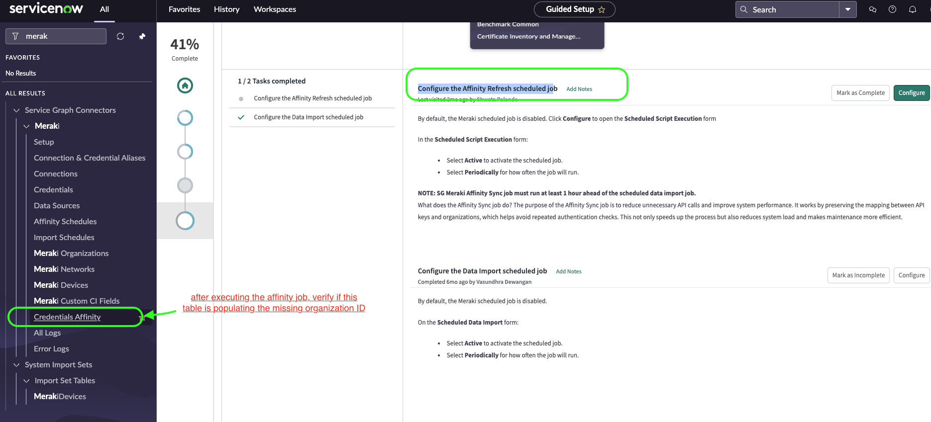 The purpose of the Affinity Sync job is to maintain a mapping between API keys and organizations, which helps avoid repeated authentication checks. If a certain organization ID is missing or not being pulled in your tables, check if the organization ID is present in the Affinity table. Within the setup guide for the Meraki ServiceGraph connector, go to "Configure the Affinity Refresh scheduled job" and run the Affinity job.